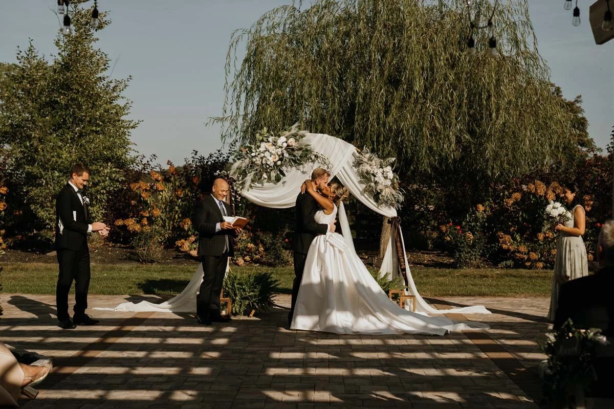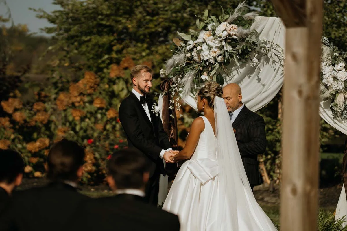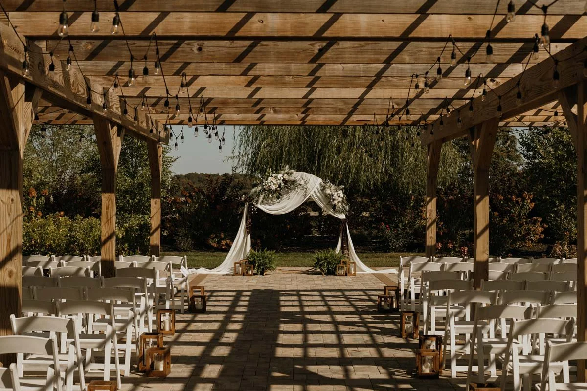 For an outdoor ceremony, the trend is moving toward immersive lighting and design. Our wooden pergola provides a natural frame that creates a stunning "shadow play" during the golden hour. By layering in lush, white floral installations and soft drapery, you can transform a garden setting into an elegant, outdoor cathedral that feels both private and grand.